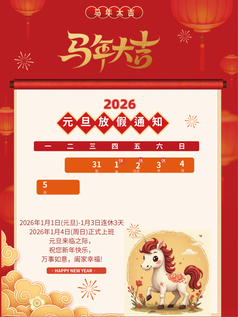 2026年1月1日(元旦)-1月3日连休3天2026年1月4日(周日)正式上班元旦来临之际,祝您新年快乐,万事如意,阖家幸福!