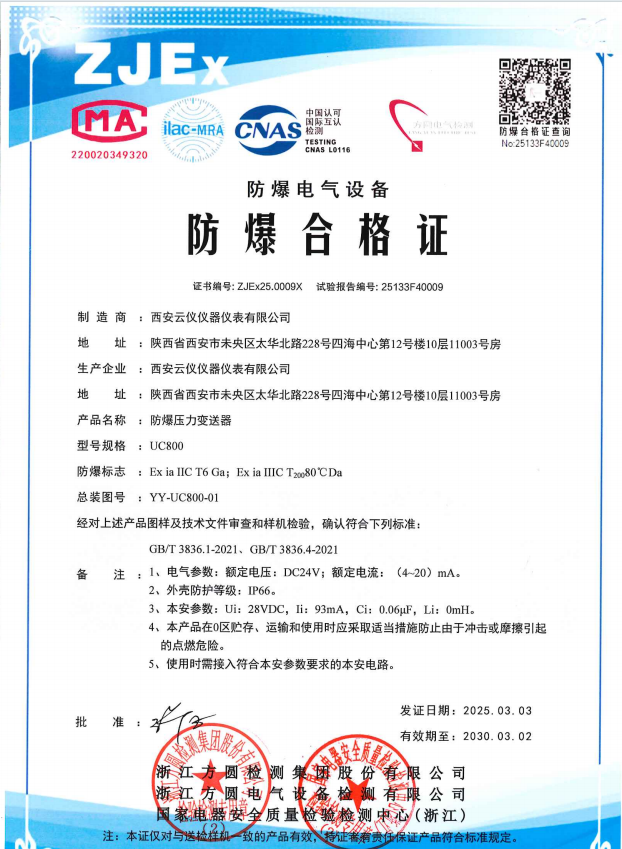 该产品拥有隔爆型和本安型防爆证书,且取得了国家知识产权局专利认证,这款产品已经问世15年,经过技术的日益成熟,现在已经是个成熟的产品,充分展现了西安云仪技术人员用匠心制匠品的持续发展精神。