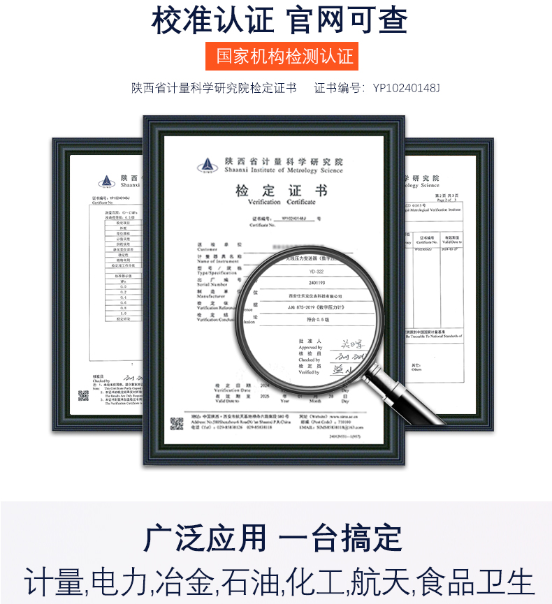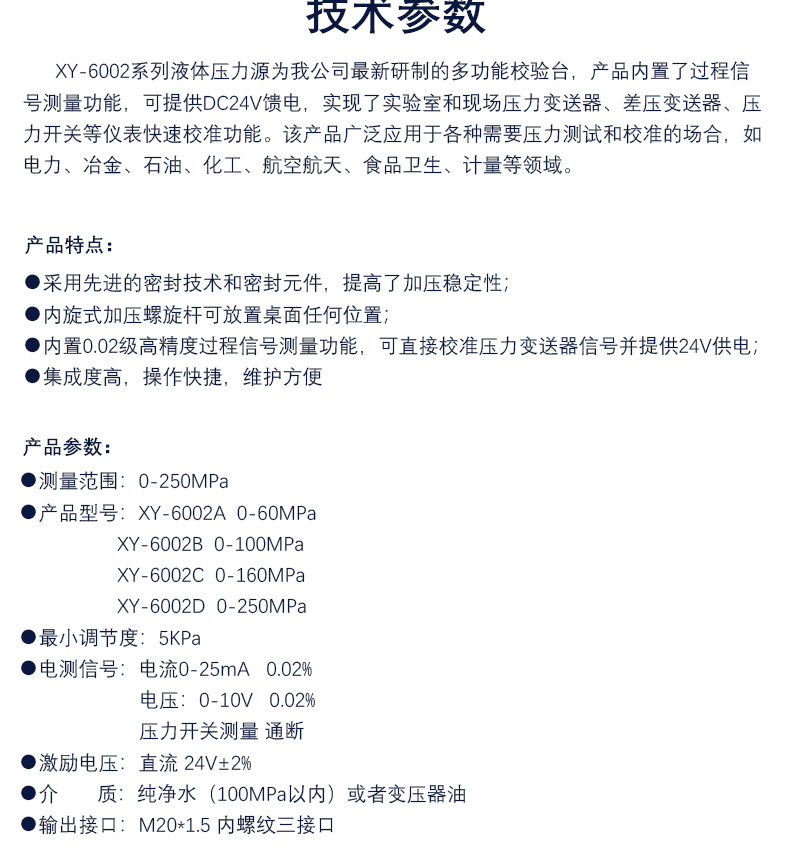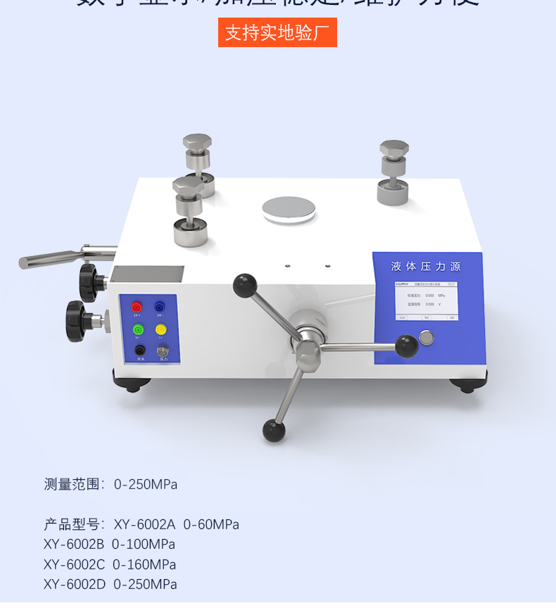 XY-6002系列液体压力源为我公司最新研制的多功能校验台,产品内置了过程信号测量功能,可提供DC24V馈电,实现了实验室和现场压力变送器、差压变送器、压力开关等仪表快速校准功能。该产品广泛应用于各种需要压力测试和校准的场合,如电力、冶金、石油、化工、航空航天、食品卫生、计量等领域。