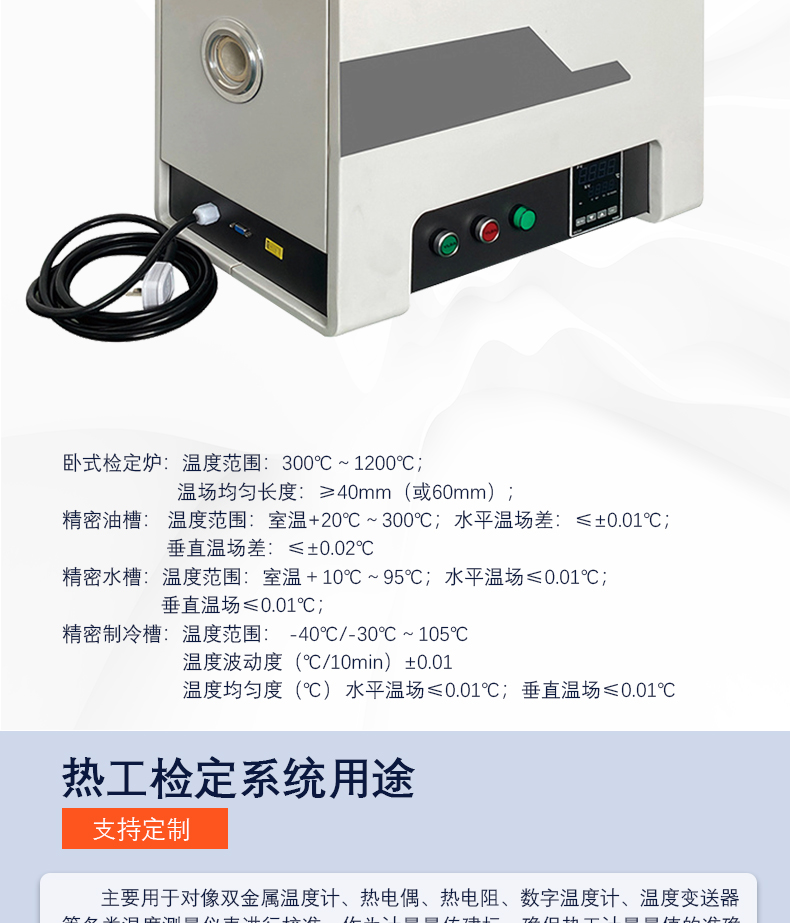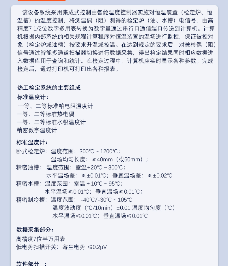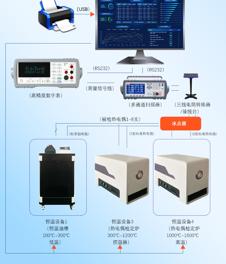 该设备系统采用集成式控制由智能温度控制器实施对恒温装置(检定炉、恒温槽)的温度控制,将测温偶(阻)测得的检定炉(油、水)电信号,由高精度7 1/2位数字多用表转换为数字量通过串行口通信端口传送到计算机。计算机根据内部系统的相关规程计算程序对恒温装置的温场进行监控,保证被控对象(检定炉或油槽)按要求升温或控温。在达到规定的要求后,对被检偶(阻信号通过智能多通道扫描器切换进行数据采集,得出检定结果同时相应数据进入数据库用于查询和统计。在检定过程中,计算机应实时显示各种参数。完成检定后,通过打印机可打印出各种报表